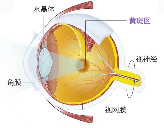人类90%以上的视觉信息来源于黄斑。黄斑是视网膜光学中心略呈黄褐色的区域。由于该区域富含色素,颜色比周围的视网膜颜色略暗,故而得名“黄斑”。