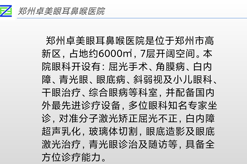 郑州卓美眼科医院是国内为数不多拥有6套近视矫正设备的眼科医院,支持全系列手术方式的开展。